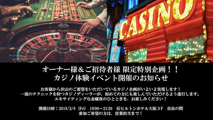 最新情報2019年 感謝祭『カジノ体験イベント』のご案内 平素は格別のお引立てを賜り、厚く御礼申し上げます。弊社に関わって下さる全ての皆様に対し、日頃の感謝を込めまして、感謝祭『カジノ体験イベント』を開催いたします。初めての方にも楽しんで頂ける内容になっています!エキサイティングな金曜夜のひとときを、お楽しみください!!