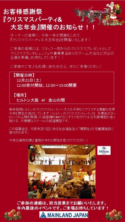 最新情報2019年 第11回 感謝祭『クリスマスパーティ&大忘年会』のご案内 平素は格別のお引立てを賜り、厚く御礼申し上げます。 弊社のオーナー様限定!! 今年一年の感謝を込めて『クリスマスパーティ&大忘年会』を開催いたします。 場所は、ヒルトン大阪の4階 クリスマスランチビュッフェや豪華景品ありのゲームを準備してお待ちしています♪ ご家族やご友人もお誘いあわせの上、ぜひご来場ください。 予約が必要になりますので、ご参加の頂ける方は、担当営業までお願いいたします。 くわしくは、下記のリーフレットをご覧ください。